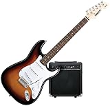 Get Start Let's Rock ~::Fender Starcaster Strat Features::~ Gloss 3 tone sunburst finish Maple neck w/ 22 fret rosewood fingerboard 3 single coil pickups 5 way pickup selector switch ~::Complete Package Includes::~ 10 watt amplifier, strings, strap, cable and picks |